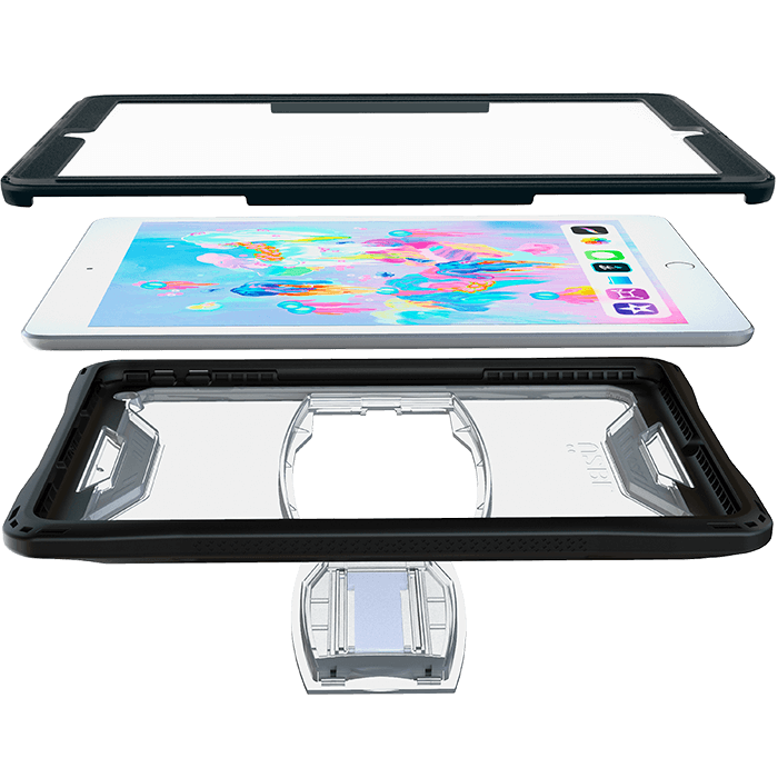 The AfterShock iPad Case is a simplistic 2-piece design that offers swift installation even for 1000+ case installs. We offer a built-in screen protector version and a slightly lower priced version with no screen protector for schools who are confident in the care that their students may have with tech. The AfterShock Gen 5/6 case is TPU co-molded construction for drop and shock protection and features a collapsible stand for greatly reduced breakage. The grooves in the front side bezel allow the AfterShock cases to be stacked for safe carrying to and from carts. We even added a removable, optional pencil holder that works with Apple Pencil or Logi Crayon. The AfterShock covers all bases in almost every K12 environment.